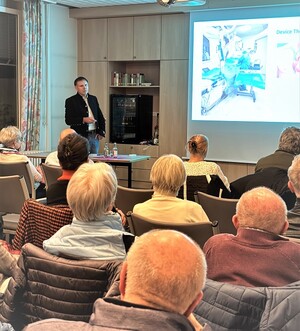 In seinem Vortrag erläuterte Dr. Staszewicz die vielfältigen Möglichkeiten der heutigen Kardiologie – von der präzisen Diagnostik mittels bildgebender Verfahren über minimalinvasive Eingriffe im Herzkatheterlabor bis hin zur strukturierten Nachsorge von Patientinnen und Patienten mit Herz-Kreislauf-Erkrankungen. Ein besonderer Schwerpunkt lag dabei auf dem neuen Herzkatheterlabor, das Anfang September 2025 feierlich eingeweiht wurde und nun mit modernster Technik ausgestattet ist.